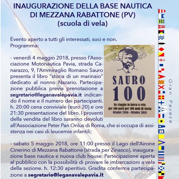 Venerdì 4 maggio 2018, presso l’Associazione Motonautica Pavia, strada Canarazzo, 9, l’Ammiraglio Romano Sauro presenta il libro “storia di un marinaio” dedicato al nonno Nazario. L’evento è pubblico e aperto a tutti. per pronotarsi inviare una mail all’indirizzo segretario@leganavalepavia.it indicando il nome e il numero dei partecipanti.questo il programma della serata:h. 20:00 cena conviviale (euro 20)h 21:30 presentazione del libro.I proventi della vendita del libro saranno devoluti all’Associazione Peter Pan Onlus di Roma, che si occupa di assistenza nei casi di leucemie infantili;
